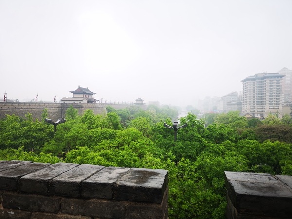 坦白讲,刚下火车的那一瞬,和梦中春日绽放在繁华之中的长安感觉略有不同,恰逢阴雨天的水墨气韵覆盖了众人对这座城的期待与想象。深陷在阴雨连绵的古城,站在历经六百多年风云变迁、周长13.74千米的西安城墙上,听导游讲着:“这里是放置炮台的地方、那里是古人作战的地方,远处就是护城河……”不禁让人联想,几百年前,这里金戈铁马、烽火连天的壮观景象。而如今,在这雨中,身处和平年代的我们,得以有幸感受这历史留下的庄严与厚重。游览间,望到雨中穿着古装拍照的游客,仿佛自己也梦回到神秘悠久的大唐长安。