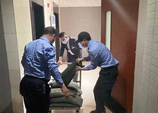 你以为至此,实战演练结束了?NO!半小时后,按照演练部署,中控室再次接到报修电话,12号楼2单元4层业主家中发生跑水现象。火速赶到现场的秩序维护人员、工程人员、客服人员、保洁人员及电梯维保公司根据演练方案,完成了发现异常、留存拍照、关闭水阀门、沙袋封堵、电梯安全检查、吸水处置、联系业主等一系列操作。跑水问题得到快速有效控制,现场无人员伤害,设施设备无受损情况,电梯跑水救援演练顺利完成。