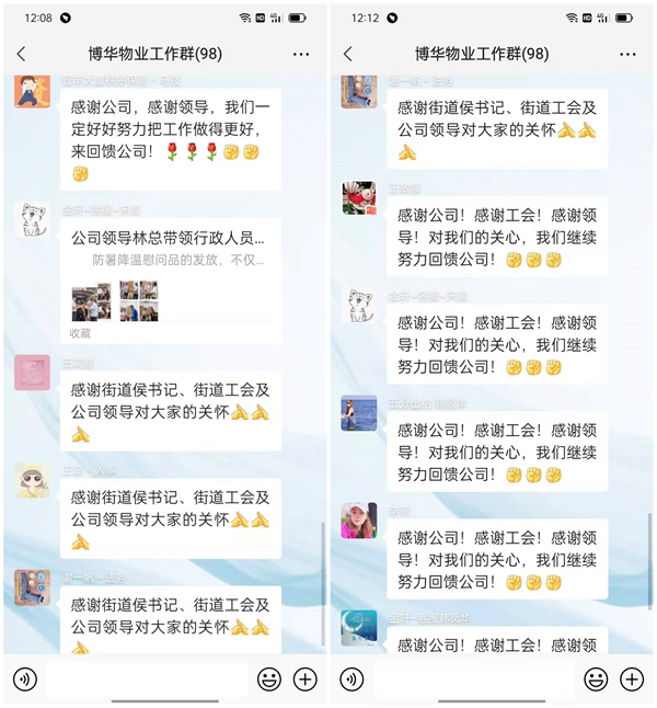 总经理梁洪利对此表示,非常感谢各级政府、鼓楼街道党工委、工会对天津公司及所有员工一如既往的支持和关心,这次党工委和工会送凉爽的活动给天津公司鼓足了干劲,相关慰问品一定实实在在地落实到每一位员工身上。同时,天津公司会合理安排高温天气的员工工作时间和强度,保障员工身体健康,更会确保各项物业服务工作始终一步一个脚印地扎实前行。