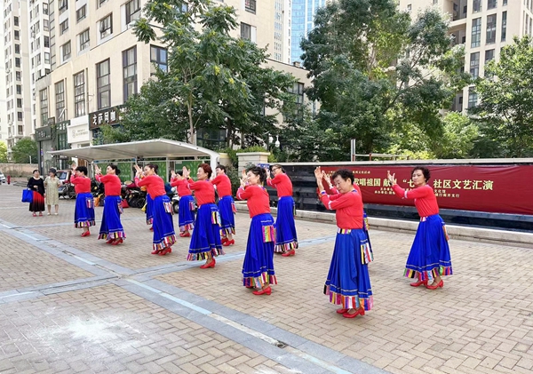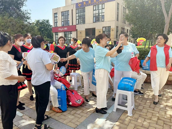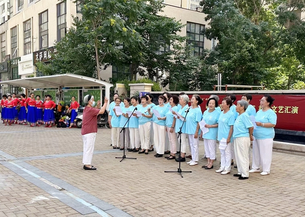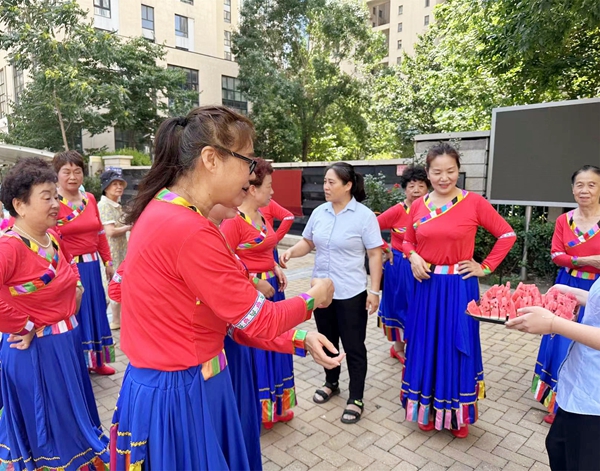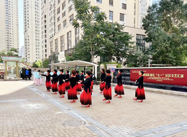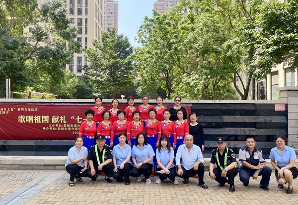 虽然炎热的小暑、大暑节气都在七月,但这丝毫阻挡不了辖区业主们的热情。社区文艺汇演这一天,太阳枝头高挂,晋丰大厦项目物业服务中心的工作人员们一大早便忙着悬挂横幅,准备起冰镇西瓜、蒲扇等消暑神器。参与演出的业主也是早早来到场地换好演出服,开始彩排、预热……这次文艺汇演的所有节目都是由在辖区居住的阿姨们自编自导的,那是对党的献礼,以一颗颗赤诚之心。